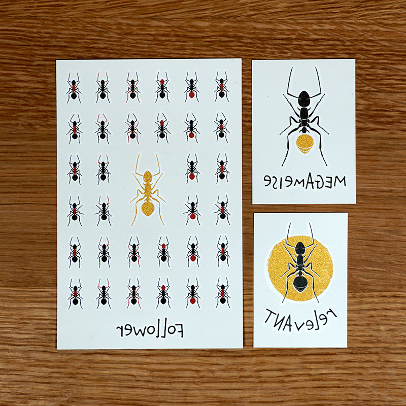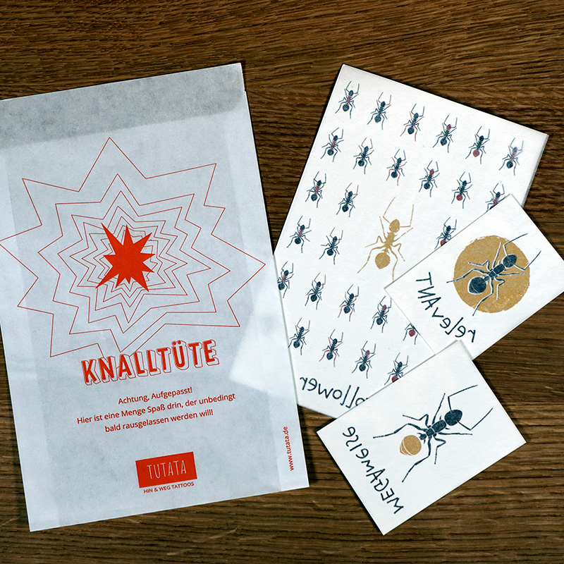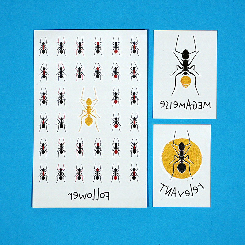 Unsere dritte Motiv-Reihe handelt von der Ameise, von ihrer vermeintlichen Stärke, ihrem Gemeinsinn und ihrem Klimabewusstsein. In diesem Bundle ist jeweils ein Blatt der drei Motive dieser Reihe enthalten: 1x Megameise (5×7 cm), 1x Relevant (4,5×6,5 cm) und 1x Follower (9×14 cm). In allen drei Tattoo-Motiven ist ein Teil in gold-metallic enthalten. Unglaublich wie das kribbelt und krabbelt!