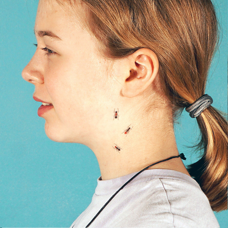Viele kleine Ameisen (inklusive gold-metallic Königin), als Ameisenstraße oder als ein großes krabbeliges und kribbeliges Durcheinander auf der Haut. Aber auch eine einzelne Ameise zB auf dem Fingerrücken oder hinterm Ohr sorgt für Entzücken. Die ganz Mutigen kleben sich eine auf die Nasenspitze. So oder so oder so, uns sind sie alle gleichermaßen wichtig.